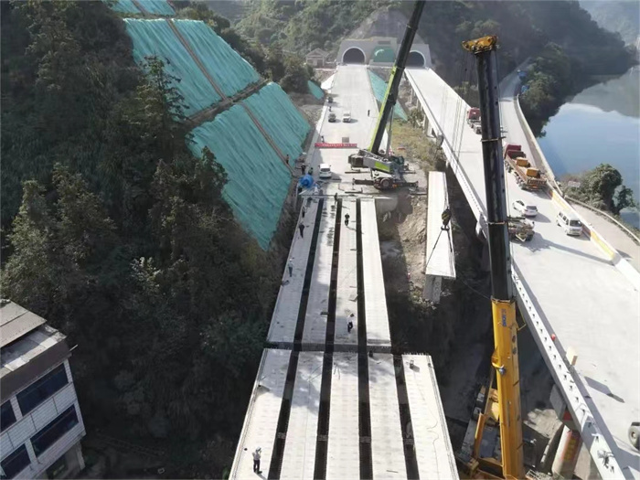 11月4日下午三時許,隨著最后一片30米T梁的成功架設(shè),衢交集團(tuán)承建的330國道麗水市塔下至臘口段公路改建工程(蓮都段)灣岙沿溪左線橋梁順利合攏,標(biāo)志著該項目沿線三座橋梁已全部架設(shè)完成。灣岙沿溪橋上部結(jié)構(gòu)設(shè)計采